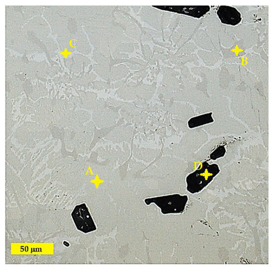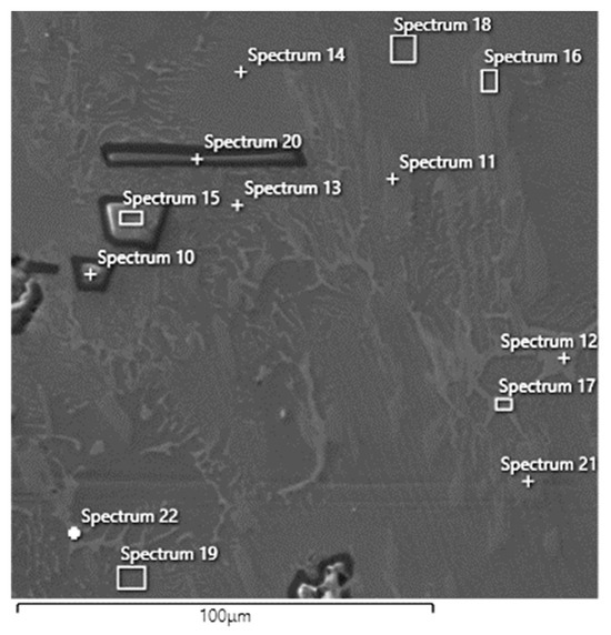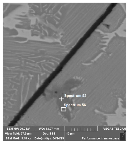 The results of the comparison demonstrate that there is little difference between the two methods. Using EDS analysis, it is possible to determine carbon content, which was not possible with XRF analysis. In addition to bulk chemical analysis (Table 2), local compositional differences between microstructural features were evaluated using EDS. This method provided spatially resolved information on the distribution of elements within different phases (Table 3), including oxide inclusions, eutectic areas, and carbide–rich regions, which could not be captured by bulk XRF analysis.