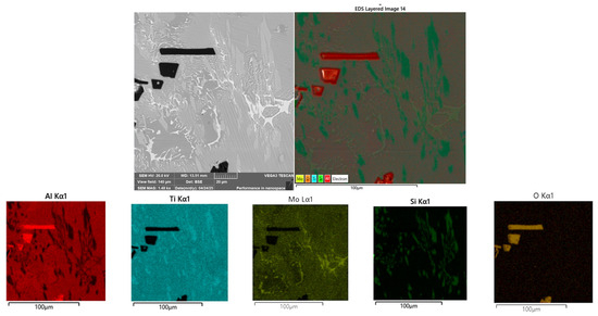 One of the shortcomings of the aluminothermic reaction is that metals are obtained from metal oxides that are contaminated with other impurity elements, and their purity is 98.5–99.5%. The purity of the final product (manufactured alloy) is lower. The lack of aluminothermic reaction and the charge composition will affect the elemental content of the alloy. In this case, Ti, Al, and Mo will also contain, in units and tenths of a percent, other impurity elements, e.g., Si, Fe, Mn, Cu, etc. Furthermore, from the perspective of the alloy preparation technology used, it is expected that oxide or carbon residues will be present in the structure in the form of carbides. Trace elements such as Si and Fe were not intentionally added but are considered to originate from impurities in the technical–grade aluminium powder and molybdenum reagent. Carbon was deliberately added in the form of graphite powder to support the formation of challenging carbide phases (TiC) during the aluminothermic reaction. The presence of these minor elements is consistent with the composition of the raw material and the processing environment.