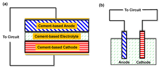 Two primary architectural configurations have been established for cement-based batteries: layered monolithic cells and probe-style cells [35], as schematically illustrated in Figure 3. In the layered configuration, the battery consists of sequentially cast cementitious anode and cathode layers, each incorporating electroactive materials, separated by a cement-based electrolyte layer [24]. Cement serves as the continuous matrix throughout, forming an integrated composite structure after curing. The electrolyte function is fulfilled by the alkaline pore solution within the cement matrix, eliminating the need for a discrete separator as found in conventional batteries. In contrast, the probe-style configuration employs discrete metal electrodes (such as rods or plates) embedded within a bulk cementitious medium that acts as the electrolyte [36]. In this setup, the cement paste or mortar, typically contained within a structural form, mimics the behavior of an alkaline salt solution, while two dissimilar metals function as the anode and cathode [23]. The probe configuration operates as a galvanic cell embedded in concrete, whereas the layered design fully integrates the electrochemical components within the cement matrix.