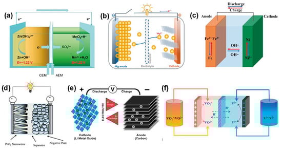 Electroactive material configurations for cement-based batteries: (a) alkaline Zn/MnO2 [108], (b) Mg-based high-voltage system [109], (c) Mg-based high-voltage system [110], (d) PbO2/Pb analog [111], (e) Li-ion intercalation framework [112], and (f) Li-ion intercalation framework [32].