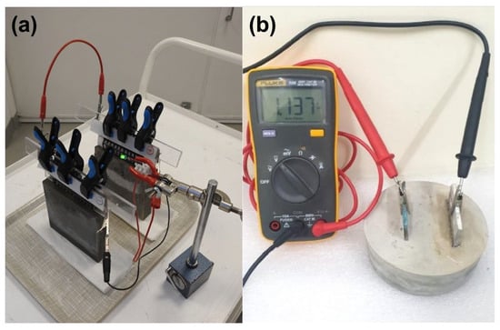In the probe-type galvanic cell (Figure 3b), the metallic anode undergoes oxidation, releasing electrons that travel through an external circuit to the cathode. Simultaneously, hydroxide ions in the cement pore solution transport ionic charge to maintain electroneutrality. This configuration operates as an embedded corrosion cell, generating current as the anode metal is gradually consumed. In contrast, the layered architecture (Figure 3a) functions as a solid-state battery embedded within the concrete. Both electrodes are integrated into the hardened matrix and facilitate complementary redox reactions, with oxidation occurring in the anode layer and reduction in the cathode layer. When connected to an external load, the layered system stores and releases charge through distributed faradaic processes, while the cement matrix serves as both an electrolyte and structural binder. The probe-type design provides single-use galvanic output determined by the metal pair’s potential difference, whereas the layered configuration allows for repeated charge–discharge cycling if reversible redox-active materials are utilized.