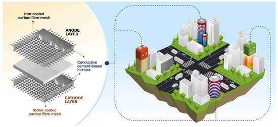 Modern infrastructure is increasingly expected to integrate smart functionalities alongside traditional load-bearing capabilities to support sustainability and resilience objectives [1,2,3]. Cement-based batteries (CBBs) have emerged as an innovative approach that allows concrete structures to store electrical energy and supply power to integrated electronic devices [4,5]. Modern infrastructure is increasingly expected to integrate smart functionalities alongside traditional load-bearing capabilities to support sustainability and resilience objectives [6,7,8]. This multifunctional concept aligns with the development of advanced building materials that combine structural performance with additional features such as self-sensing, thermal regulation, electromagnetic shielding, and internal energy storage [9,10,11,12]. Embedding energy storage directly within structural materials has the potential to support zero-energy or energy-positive buildings by enabling renewable energy harvesting, autonomous sensor operation, and on-site power for monitoring and maintenance systems [13,14,15,16].