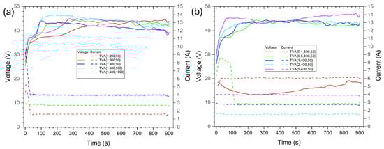 Current–time and voltage–time curves for the PEO process in ternary eutectic electrolyte: (a) series with varying voltage and frequency; (b) series with different ADP concentrations.