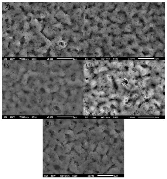 SEM images of surface morphologies obtained by PEO under varying electrical parameters: (a) 200 V/50 Hz; (b) 300 V/50 Hz; (c) 400 V/50 Hz; (d) 400 V/500 Hz; (e) 400 V/1000 Hz. All coatings were synthesized in molten electrolytes with 1 wt.% ADP.