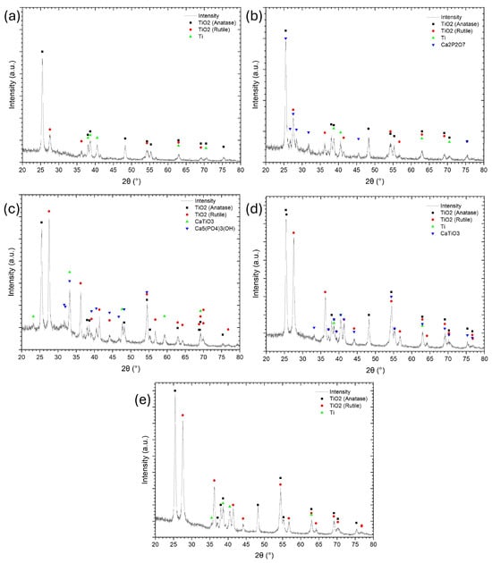 XRD patterns showing the phase composition of ceramic coatings obtained by PEO with varying ADP concentrations: (a) 0.1, (b) 0.5, (c) 1, (d) 2, and (e) 5 wt.%. All coatings were synthesized at 400 V and 50 Hz.