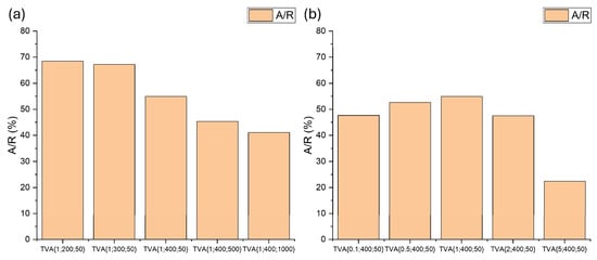 The anatase-to-rutile (A/R) ratio of PEO ceramic coatings: (a) synthesized with 1 wt.% ADP under varying voltages and frequencies; (b) formed with different ADP contents with fixed electrical parameters of 400 V and 50 Hz.