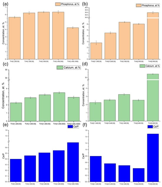 It can be concluded that vanadium and aluminum were incorporated into the PEO coating in a relatively consistent ratio across most samples. An exception was observed for sample TVA {0.1; 400; 50}, which demonstrates a higher concentration of aluminum and vanadium due to the failure of proper PEO coating formation, as mentioned earlier. Additionally, the sample TVA {5; 400; 50} exhibits an almost fully covered Ca/P surface, as supported by SEM morphology and cross-sectional EDX mapping.