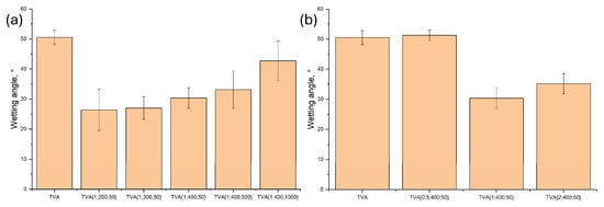 The contact angle of the ceramic coatings obtained by PEO with the following: (a) an addition of 1 wt.% of ADP under varying voltages and frequencies and (b) different ADP contents under electrical parameters of 400 V and 50 Hz.