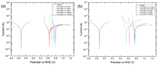 Corrosion behavior (Tafel plots) of ceramic coatings synthesized by PEO conducted in ternary eutectic electrolyte with the following: (a) an addition of 1 wt.% ADP under varying voltages and frequencies; (b) different ADP contents at fixed electrical parameters of 400 V and 50 Hz.