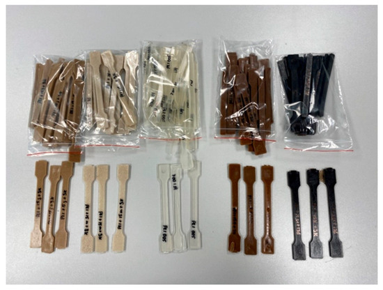 The composites with varying wt% of fillers are summarized in Table 2 and visualized in Figure 1. Standard dumbbell-shaped specimens were produced using a universal injection molding machine (KM 40-125 Winner, Krauss Maffei, Munich, Germany) in accordance with the PN-EN ISO 3167 [44] standard, with final specimen dimensions of 10 × 4 × 150 mm.