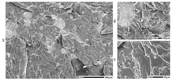 The structure of the obtained PLA-based composites was analyzed using scanning electron microscopy (SEM) in order to evaluate the distribution and adhesion of the natural fillers seashells, eggshells, walnut shell powder, and coffee grounds within the polymer matrix. Representative SEM micrographs taken at different magnifications are shown in Figure 2, Figure 3, Figure 4 and Figure 5 for each composite to illustrate the morphology of the fractured surfaces after tensile failure.