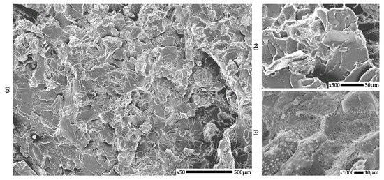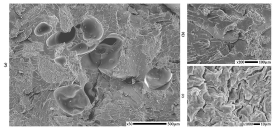 SEM images of PLA composites with seashells: (a) 50× (b) 100×, (c) 1000× magnification.