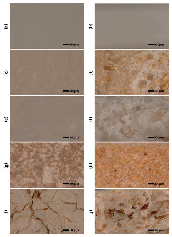 Optical images of breakouts of PLA and its composites before (left panel) and after aging (right panel): (a,b)—PLA, (c,d)—PLA15S, (e,f)—PLA15E, (g,h)—PLA15W, (i,j)—PLA15C.