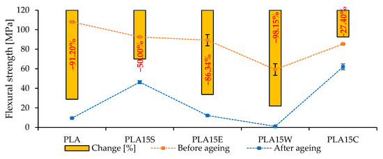 The PLA composite with walnut shells (PLA15W) exhibits the most severe decline in mechanical performance. The tensile strength falls from about 30 MPa to just 0.45 MPa after aging, indicating a 98.5% reduction. This extreme deterioration is probably due to the high hygroscopicity of walnut shells and their weak interfacial adhesion with the polymer matrix, which promotes moisture uptake and microcrack formation.