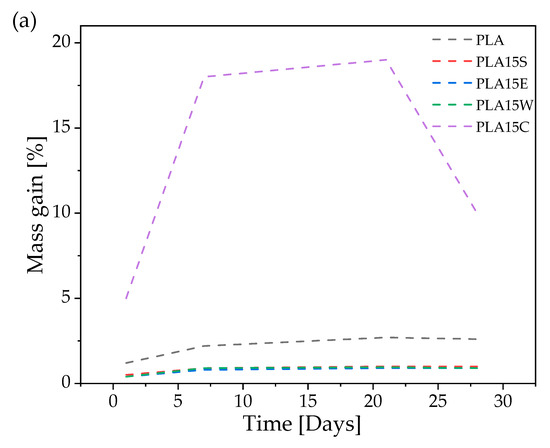 Mass gain (a) and kinetics of degradation (b) of PLA and its composites.