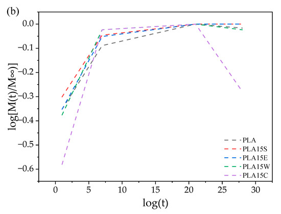 The lowest water absorption was observed in PLA15W, which contains walnut shell powder. This lignocellulosic filler has relatively low polarity and a fatty-acid-rich surface that limits water interaction. The low diffusion coefficient (D = 6.44628·10−12 m2/s) and higher R2 value (0.855) confirm that walnut shell addition leads to a reduced and more uniform moisture uptake, enhancing the hydrolytic stability of the composite.