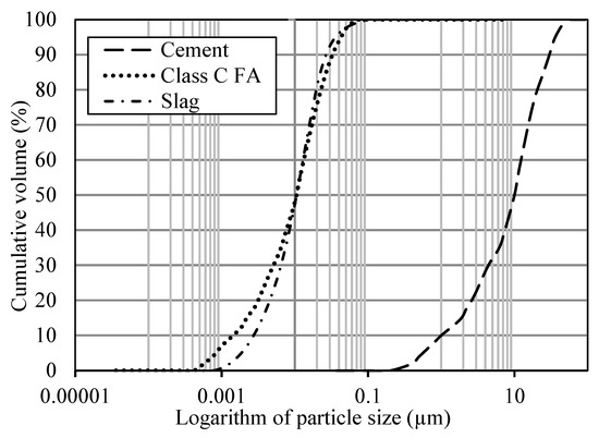 A Type I ordinary Portland cement (OPC) conforming to ASTM C150 [25], Class C fly ash (FA) in accordance with ASTM C618 [26], and ground-granulated blast-furnace slag (slag) meeting ASTM C989 [27] were used as the primary cementitious materials. Their physical and chemical properties, including Blaine fineness, are summarized in Table 1, with chemical compositions determined by X-ray fluorescence (XRF). The particle size distributions of OPC, FA, and slag are shown in Figure 1. River sand and locally sourced crushed limestone from Missouri served as fine and coarse aggregates, respectively. The fine aggregate had a fineness modulus of 2.6 and specific gravity of 2.57, while the coarse aggregate had a nominal maximum size of 25 mm, specific gravity of 2.72, and SSD absorption of 1%. Particle size distributions for both aggregates are presented in Figure 2.