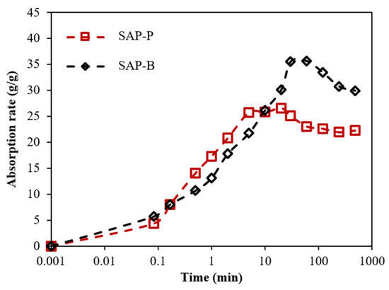 The absorption capacity of the SAPs was determined using the tea bag method [29] in a filtrated pore solution, both with and without chemical admixtures. The solution was derived from a ternary binder composition comprising 52% OPC, 35% slag, and 13% FA, and extracted from a paste mixture with a w/b of 5. To evaluate absorption kinetics, approximately 0.2 g of dry SAP was placed into a pre-weighed tea bag. The sealed tea bag was then submerged in 500 mL of the test solution. At specified time intervals—10 s, 20 s, 30 s, 1 min, 5 min, 10 min, 30 min, 60 min, 2 h, 4 h, and 8 h—the tea bag was removed, placed on a dry cloth, gently blotted with another cloth for approximately 10 s to remove excess and weakly bound liquid, and then weighed. The absorption capacity was calculated based on the weight gain of the tea bag over time. The times for SAP-P and SAP-B to reach maximum liquid absorption were 10 and 60 min, respectively, as shown in Figure 3.