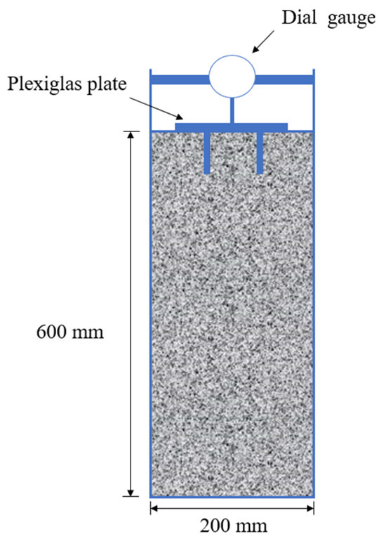 The fresh properties of the concrete mixtures—including slump, unit weight, air content, and surface settlement—were evaluated. Slump and air content were measured approximately 5 min after water–binder contact for the reference mixture, and at approximately 15 min for the SAP-modified mixtures. Unit weight and air content were determined in accordance with ASTM C138 [31] and ASTM C231 [32], respectively, while slump was measured according to ASTM C143 [33]. Mixture stability was assessed using a surface settlement test [34], as illustrated in Figure 4. Fresh concrete was placed in a PVC column with a diameter of 200 mm and a height of 600 mm. A 0.002 mm dial gauge, fixed to an acrylic plate resting on the concrete surface, was used to monitor settlement over time until a steady-state condition was reached. The final settlement was expressed as a percentage by dividing the measured displacement by the column height (600 mm). All tests were conducted in duplicate to verify result reproducibility.