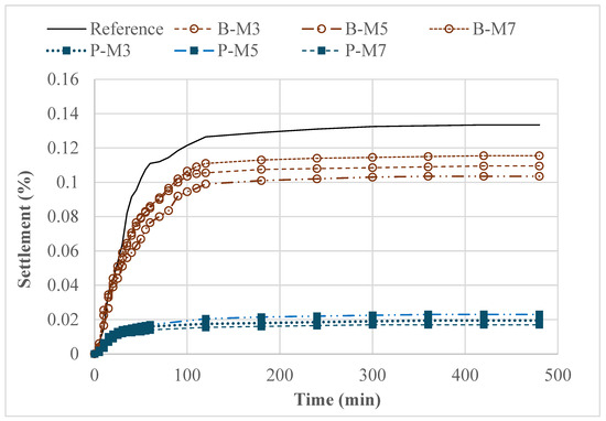 Moreover, extended mixing time exhibited minimal influence on the surface settlement of mixtures containing SAPs. For example, mixtures incorporating 100% IC with SAP-B and extended mixing times from 3 to 7 min exhibited surface settlement values ranging narrowly from 0.10% to 0.12%. Overall, the observed reduction in surface settlement due to SAP incorporation highlights their efficacy in enhancing the stability of fresh HPC mixtures. This effect is particularly relevant in applications where dimensional accuracy and surface integrity are critical, such as in precast elements or concrete cast on inclined planes. This stability simplifies process control during mixing and offers practical benefits in field applications where precise timing may be difficult to maintain.
