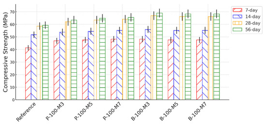 Figure 6 presents the compressive strength of the HPC mixtures incorporating SAPs, prepared with varying extended mixing times (i.e., 3 min, 5 min, and 7 min) and tested at different curing ages. The results indicate that the use of SAP-P and SAP-B enhanced the compressive strength by approximately 10–15% and 10–20%, respectively. These findings are consistent with previous studies, which have shown that internal curing (IC) provided by SAPs can improve compressive strength by promoting continued hydration. However, it is also recognized that the desorption of SAPs can leave behind voids that partially offset the beneficial effects of IC. This dual effect was also observed in the present study. Furthermore, variations in extended mixing times exhibited minimal influence on compressive strength. For example, the mixtures prepared with SAP-P showed compressive strength deviations within 5% across all mixing durations. This suggests that a 3 min extended mixing time was sufficient to achieve uniform dispersion of both SAP types, ensuring consistent mechanical performance.