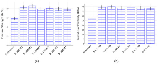 Moreover, the variation in extended mixing time had no significant effect on either flexural strength or MOE at 28 days. All mixtures containing SAPs exhibited consistent improvements in these mechanical properties across the three mixing durations. For example, the flexural strength of mixtures with SAP-P increased by 14–17% regardless of the extended mixing time. These findings suggest that a 3 min extended mixing time is adequate to achieve uniform SAP dispersion, thereby maximizing their mechanical benefits without requiring prolonged mixing.