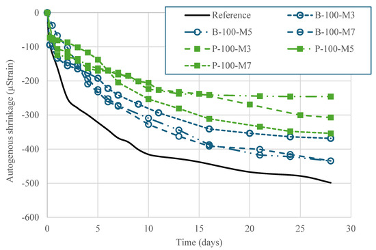 Autogenous shrinkage of HPC made with SAPs and different extended mixing times.