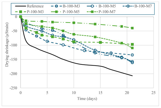 Figure 8 illustrates the autogenous shrinkage behavior of the HPC mixtures incorporating SAPs, prepared with three different extended mixing times (3, 5, and 7 min). The results clearly indicate that the inclusion of SAPs markedly reduced autogenous shrinkage in comparison to the reference mixture without SAP. Notably, the 28-day autogenous shrinkage of the mixtures incorporating SAP-P was reduced by approximately 30–50% across all mixing durations. Internal curing by SAPs improves concrete performance through two mechanisms: (i) supplying additional water to compensate for shrinkage, and (ii) homogenizing moisture distribution and regulating water desorption over time. In this study, with a moderate w/b of 0.37 and no additional water, the latter mechanism was more critical. The substantial reduction in autogenous shrinkage can be attributed to the internal curing effect provided by SAPs, which gradually release absorbed water, thereby maintaining internal relative humidity, homogenizing moisture distribution, and sustaining hydration during the early stages of curing. Figure 9 depicts the drying shrinkage trends of HPC mixtures subjected to three levels of extended mixing. Baseline measurements were taken after 7 days of curing in a lime-saturated solution. By 21 days, all mixtures showed shrinkage values below 300 µ strain. The addition of SAPs effectively suppressed shrinkage at all mixing durations. In particular, incorporating SAP-P lowered the 28-day drying shrinkage by 43–76%, depending on the mixing time.