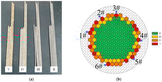 The corrosion characteristics of the cable-stayed cable after service were checked based on the classification description of the corrosion degree given in the Technical Code for Bridge Maintenance of Highway Cable Structure System (JTGT 5122-2021) []. It was determined that the corrosion grade of the steel wire in the old cable was between II and V. The typical corrosion conditions corresponding to each corrosion grade are shown in Figure 2a. The proportion of steel wires with corrosion grade II is relatively large; the proportion of steel wires with corrosion grade V is relatively small. In this study, six steel wires with a corrosion grade of V at  of the cable were selected for a statistical study of corrosion. The position of the steel wires is shown in Figure 2b.
