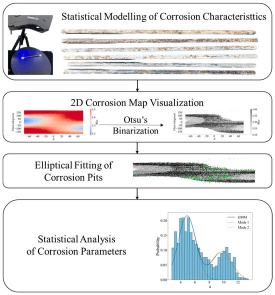Connected pixel domains within the binarized images were identified, followed by minimum bounding ellipse fitting to delineate corrosion pits. Elliptical parameters were subsequently employed for dimensional characterization of the pits, enabling quantitative statistical analysis of the corrosion feature attributes.