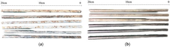 Corrosion of corroded wires is indicated for the removal of corrosion products according to international standards (ISO) [] using a solution of  of hydrochloric acid () and  of hexamethylenetetramine, diluted in distilled water to a total volume of . The corroded wire is soaked in solution for 10 min to remove the corrosion products from the high-strength wire. The wire is then rinsed with tap water, gently brushed with a clean steel wool ball, and then rinsed in deionized water. The wire sample is then naturally dried and cooled to room temperature. The effect before and after rust removal is given in Figure 4 (the sample number is 1#−6# from top to bottom). The mass of the sample is weighed on a highly accurate electronic balance before and after rust removal; the values are denoted as , respectively. The mass loss rate  is calculated according to Equation (1).