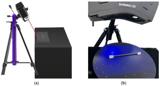 A 3D laser scanner (Figure 5a) with an accuracy range of 3–50 μm was used to obtain the corrosion parameters for a 150 mm steel wire cross section. Grip both ends of the wire securely with a custom swivel clamp to prevent any slippage that could affect alignment. Finally, the steel wire is placed on the turntable along the fixture, and the irregularly distributed marking points are fixed on the turntable and the fixture. Seamless alignment of the wire surface is achieved through the rotation of the fixture and turret (Figure 5b), resulting in point cloud data that accurately represents the surface characteristics of the corroded wire.