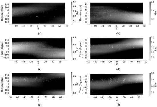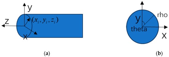 The point cloud data obtained by 3D laser scanning can be exported as  data, where  is the circumferential direction of the wire surface.  represents the displacement of the middle of the wire along the length of the wire and the coordinate origin (Figure 7). According to Equation (2), the wire cross section is converted into a polar representation according to the data, and the axial coordinate  remains unchanged. Figure 8 shows the 2D corroded surface of the specimen after coordinate transformation.