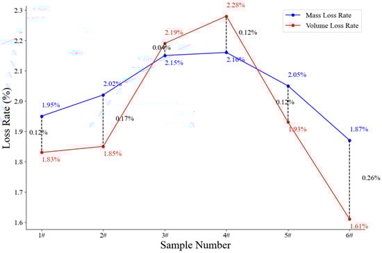 where  is the theoretically equivalent original volume,  is the axial coordinate,  is the circumferential angle,  is the initial steel wire radius, and  is the radius of the corroded steel wire at each point. Since  are equal at each point, the volume loss rate is proportional to the radius difference ratio and the volume loss rate is proportional to the mass loss rate. So, the average radius loss rate is used to evaluate the quality of the 3D scanning model by comparing it with the mass loss rate before and after rust removal. Equation (5) gives the calculation method of the average radius loss rate, and Figure 9 gives the comparison of the average radius loss rate with the mass loss rate. As can be seen from Figure 9, the steel wire model reconstruction through 3D laser scanning data is of good quality, and the error of each sample is not large.