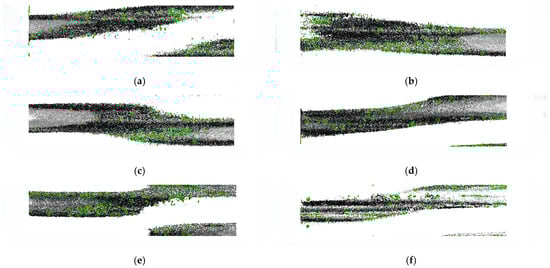 The elliptical direction angle  represents the angle between the major axis and the horizontal direction. When , it means that the major axis of the elliptical is along the length of the corroded steel wire; when , it means that the major axis of the elliptical is along the circumference of the steel wire. The ratio of the short axis to the long axis  defines the geometric characteristics of the wire corrosion pit, characterizing the sharpness of the corrosion pit. Lower values represent the sharper areas of the corrosion pit []. Figure 12 gives the corrosion pit results fitted according to the above method. The green regions indicate the elliptical corrosion pits obtained using the proposed method for corrosion pit fitting.