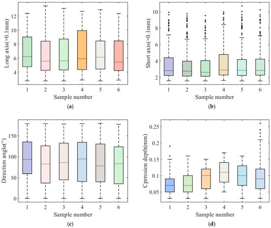 Figure 13a–d show the analysis results of the sample data, characterized by a 3D scan. These figures describe the distribution of the elliptical major axis, minor axis, directional angle, and depth of the corrosion pit. It can be seen from Figure 13a,b that the distribution ranges of the long and short axis of the corrosion pit in the six samples are roughly the same. The short axis of the corrosion pit has abnormal points greater than the upper limit, indicating that during the corrosion process. Meanwhile, the length distribution of the corrosion pit is relatively uniform, and the width development rate is irregular. Figure 13c shows that the corrosion pit direction angles of the six samples exist within the range of ; the upper and lower quartile positions of the six samples are basically the same. In Figure 13d, it can be seen that although the distribution of other geometric parameters of the corrosion pit is roughly the same, the distribution of the six samples with corrosion pit depth is relatively different. The median corrosion depth of the sample 4# is the largest. There are large abnormal depth data for sample 6# and sample 1#.