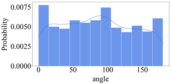 The six samples are the outermost steel wires of the cable, and the samples are not very different. In order to expand the statistical dataset to reduce statistical errors caused by accident or the small data volume, improving the accuracy of statistical results analysis, the 1#~6# sample data is combined to be called the enlarged dataset. The enlarged dataset  is verified using the 1# sample data. Figure 14 shows the distribution of the directional angle of the corrosion pit. It can be seen that the directional angle is relatively uniform, and it is difficult to fit using the probability function. However, it is not difficult to find that the probability of the directional angle distributed near  and  is relatively high.