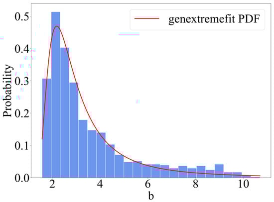 The statistical distribution of parameter  can be fitted with a generalized extreme value (GEV) distribution. The K–S test does not reject the generalized extreme value distribution function at a 95% significance level. Figure 15 gives the fitting effect of parameter . As shown in the results, the width  of the corrosion pit is mainly concentrated at ; the larger the width, the smaller the probability. The generalized extreme value distribution can be written as Equation (19):  is a shape parameter;  is a positional parameter; and  is a scale parameter.