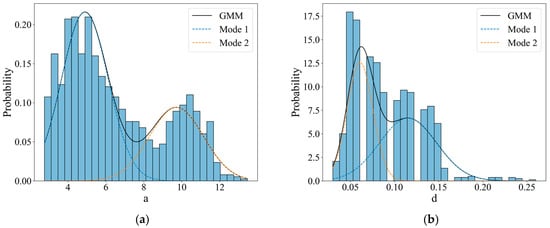 GMM distributions of (a) parameter  (×10−1 mm) and (b) parameter  (mm).