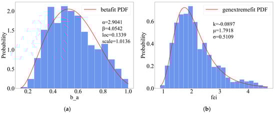 The K–S test found that at the 95% significance level, the aspect ratio does not reject the Beta distribution function, while the defect parameters do not reject the generalized extreme value distribution. Therefore, the aspect ratio conforms to the Beta distribution and the defect parameters conform to the generalized extreme value distribution. The Beta distribution function is as Equation (22), where  and  represent shape parameters,  represents positional parameters, and  represents scale parameters. The distribution diagram of the aspect ratio and defect parameters is shown in Figure 17.