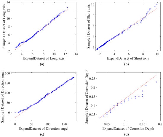 The expanded dataset and the 1# dataset Quantile–Quantile diagram of four basic parameters. (a) Elliptical corrosion pit long axis (). (b) Elliptical corrosion pit short axis (). (c) Direction angle of elliptical corrosion pit (. (d) Elliptical corrosion pit depth .