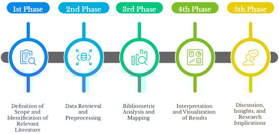 This bibliometric study was conducted following a systematic methodology, which structures the process into five distinct and sequential phases. Each phase is represented in Figure 1, which outlines the overall workflow adopted for this review. The phases include: (i) definition of objectives and identification of relevant literature, (ii) data retrieval and preprocessing, (iii) bibliometric mapping, (iv) interpretation and consolidation of results, and (v) discussion of the impact and implications of the findings. This stepwise approach ensures methodological transparency, reproducibility, and a clear path from data acquisition to interpretation.