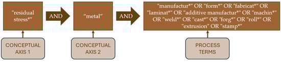 In the first phase, the scope of the study was defined, and the main axes of analysis were established. This involved identifying the core concepts and technical terminology associated with residual stresses in the context of metal manufacturing. As part of this stage, a search strategy was developed to encompass both the phenomena under investigation (residual stresses) and the materials and processes involved. To ensure a comprehensive literature search, a search string was developed using a keyword matrix that combined conceptual and process-related terms, as detailed in Figure 2. The search terms were grouped into three key components: (i) Conceptual Axis 1, where the primary scientific concept was “residual stress *”, with the asterisk (*) ensuring the inclusion of both singular and plural forms, as well as potential derivations; (ii) Conceptual Axis 2, where the material focus was defined using the term “metal *”, which allows for retrieval of the literature referring to metals, metallic components, or metal-based systems, following the asterisk strategy; and (iii) Process Terms, referring to the operations in which residual stresses commonly occur, such as manufacturing, forming, fabrication, lamination, machining, welding, casting, forging, rolling, extrusion, and stamping, which have been included. Here, by using Boolean operators (AND, OR), the search string was constructed to intersect the conceptual axes with relevant manufacturing processes. This method allowed us to retrieve studies that explicitly address residual stress within metallic systems subjected to various fabrication or forming techniques.