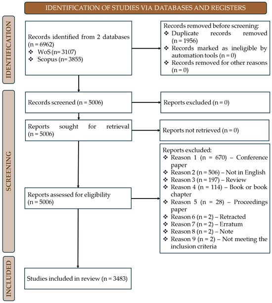 PRISMA 2020 flow diagram illustrating the literature screening and selection process. The diagram outlines the number of records identified from Scopus and Web of Science, duplicates removed, documents excluded by type or language, and the final dataset of 3483 articles included for bibliometric analysis.