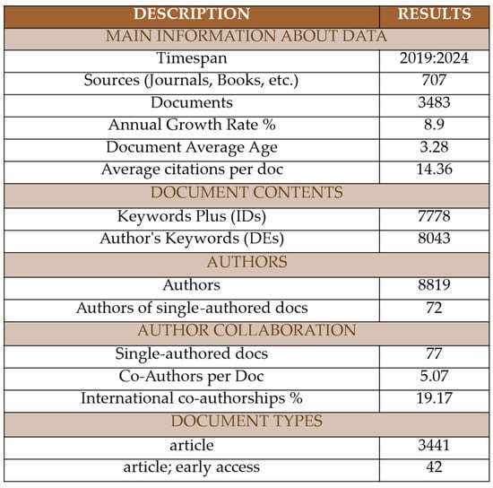 Summary of descriptive bibliometric indicators for the final dataset (2019–2024), including number of articles, sources, authors, collaboration metrics (e.g., co-authorship index), keyword occurrences, document types, and average citation metrics.