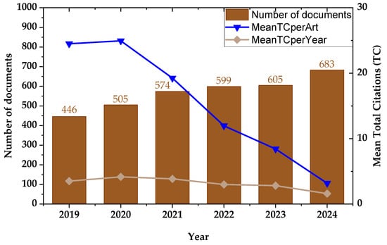 Figure 5 shows the annual evolution of scientific output and citation performance in the area. The brown bars represent the number of documents published each year, showing a steady increase from 446 publications in 2019 to 683 in 2024, which reflects a clear upward trend and growing research interest in the topic. Overlaid on the bar chart, the blue line plots the average number of total citations per article (Mean TC per Article), while the beige line represents the average total citations received per year (Mean TC per Year). Although the number of publications increased annually, the mean citations per article and per year displayed a declining trend, particularly after 2020. This pattern suggests that newer publications have not yet had sufficient time to accumulate citations at the same rate as earlier works—a common phenomenon in rapidly evolving fields, where the pace of publication outstrips the time required for citation maturation. Nonetheless, the consistent growth in publication output underscores the expanding scientific attention and relevance of the field.