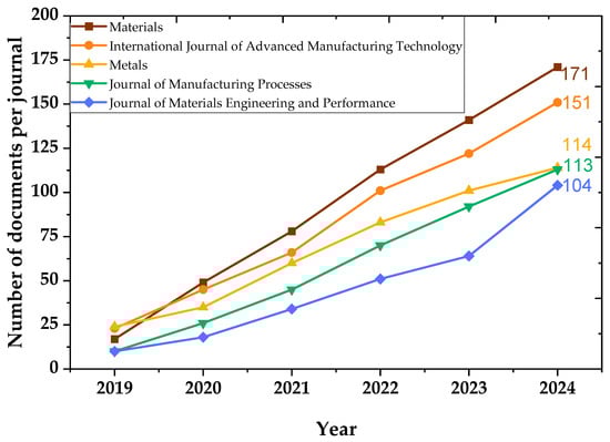 Figure 6 presents the annual number of publications from the five most prolific journals between 2019 and 2024. Materials exhibits the most significant growth, peaking at 171 documents in 2024. In addition, International Journal of Advanced Manufacturing Technology and Metals has shown sustained increases in scientific output, indicating a robust and expanding research environment. Journal of Manufacturing Processes and Journal of Materials Engineering and Performance also reflect consistent growth, though at a slightly lower rate. This trend confirms a growing research focus on residual stresses, closely aligned with the evolution of advanced manufacturing technologies. The rising number of documents per year underscores the field’s maturation and the increasing complexity of manufacturing challenges that require detailed stress analysis and control.