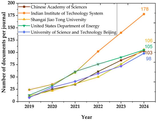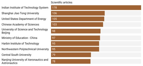Figure 7 illustrates the leading institutions in terms of total number of publications. The Indian Institute of Technology System (IITS) clearly dominates the field with 178 articles, significantly surpassing Shanghai Jiao Tong University (106) and the United States Department of Energy (105). The presence of three Chinese institutions (Shanghai Jiao Tong University, University of Science and Technology Beijing, and the Chinese Academy of Sciences) and one Indian institution in the top five emphasizes the prominent role of Asia in driving research in this domain. It is also notable that several of these institutions are either directly supported by national governments or play a strategic role in national technological development, such as the Ministry of Education for China and the US Department of Energy.