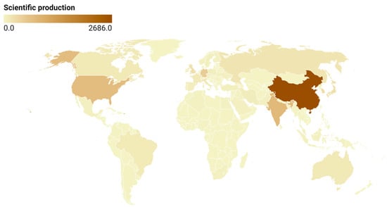 Table 3 complements the production data with citation impact, revealing interesting contrasts between quantity and quality. China leads in total citations (16,409), but with a relatively modest average of 13.8 citations per article, suggesting a high volume of output with moderate per-paper influence. In contrast, Singapore exhibits a remarkably high average citation rate of 55.2 despite a relatively small number of publications (1326 citations), indicating that its contributions, though fewer, are particularly impactful. The United Kingdom (27.0), United States (22.7), and Italy (22.0) also demonstrate strong citation performance, balancing volume with scholarly visibility. These patterns suggest that while China is the dominant contributor in terms of quantity, Western countries often produce work that garners broader academic recognition.