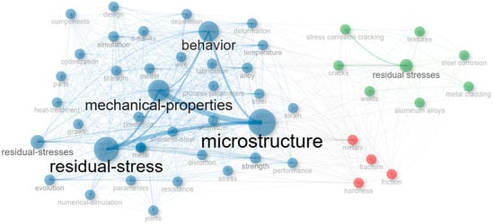 The largest and most central nodes—residual-stress, microstructure, and mechanical-properties—form the conceptual nucleus of the field. These keywords are connected to subdomains related to simulation and physical modeling (model, temperature, distortion, simulation), as well as to performance-oriented concepts such as behavior, performance, and resistance. This network structure highlights how the field balances physical process understanding with performance optimization, as stated in the literature [,,].